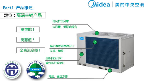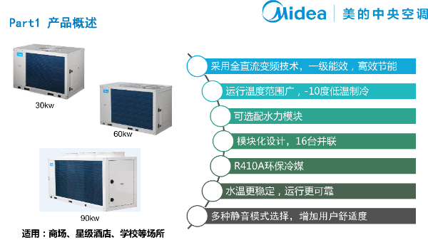 產(chǎn)品描述:熱泵型風(fēng)冷模塊機(jī)組是以空氣為冷熱源,水作為傳熱介質(zhì)的中央空調(diào)機(jī)組。該機(jī)組可與風(fēng)機(jī)盤管、空調(diào)箱等一起組成集 中式空氣調(diào)節(jié)系統(tǒng),實(shí)現(xiàn)夏季制冷、冬季采暖。美的G型風(fēng)冷模塊機(jī)組采用模塊化設(shè)計.基準(zhǔn)模塊包括: 30kW、 65kW、 130kW, 模塊最多可并聯(lián)16臺,形成30kW~1040kW范圍內(nèi)的組合產(chǎn)品。美的風(fēng)冷模塊機(jī)組廣泛適用于新建和改建的大小工業(yè)與民用建筑工程、對運(yùn)行噪音和周圍環(huán)境有較高要求、缺水或不便安裝冷卻塔的場所。特別適用于賓館、酒店餐廳、超市、商場、寫字樓、影劇院、廠房等各類建筑物。